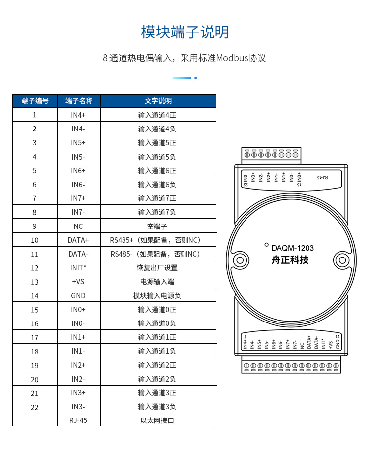 详细信息 DAQM-1203 采用标准 ModbusTCP 协议,支持多种组态软件、PLC 系统。用于热电偶测温、 mV 信号采集系统,支持各个通道量程独立配置。支持 DC9-30V 宽工作电压,标准导轨安装, 通讯口及模拟量通道全部使用光电隔离,隔离电压达 2500V,同时通讯口有防静电防浪涌设 计,以太网接口采用 10/100Mbps 自适应兼容各种 PLC、触摸屏及组态系统。