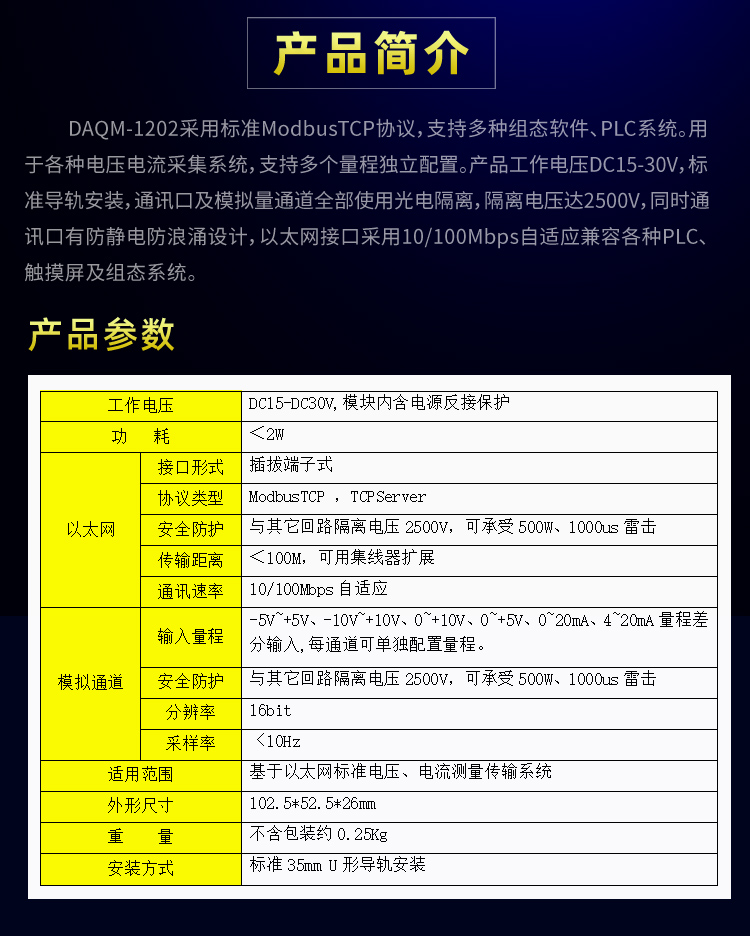 DAQM-1202 采用标准 ModbusTCP 协议,支持多种组态软件、PLC 系统。用于各种电压电 流采集系统,支持多个量程独立配置。产品工作电压 DC9-30V,标准导轨安装,通讯口及模 拟量通道全部使用光电隔离,隔离电压达 2500V,同时通讯口有防静电防浪涌设计,以太网 接口采用 10/100Mbps 自适应兼容各种 PLC、触摸屏及组态系统。